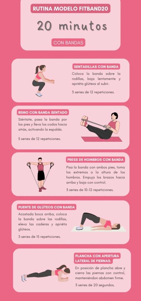 ➡️ FitBand20 fue creado especialmente para mujeres ocupadas, con rutinas cortas (20 min) y un plan progresivo que se adapta a tu nivel.